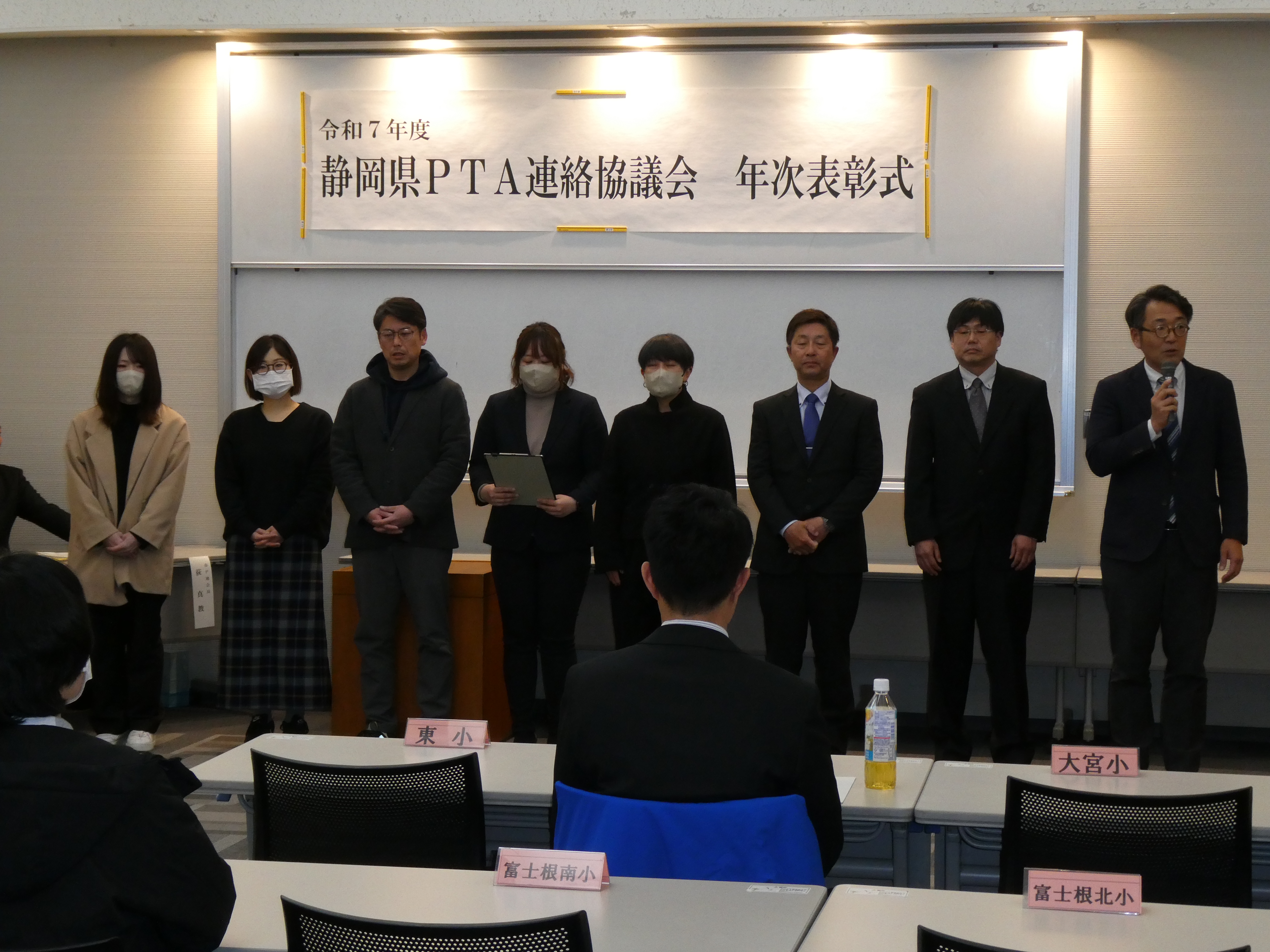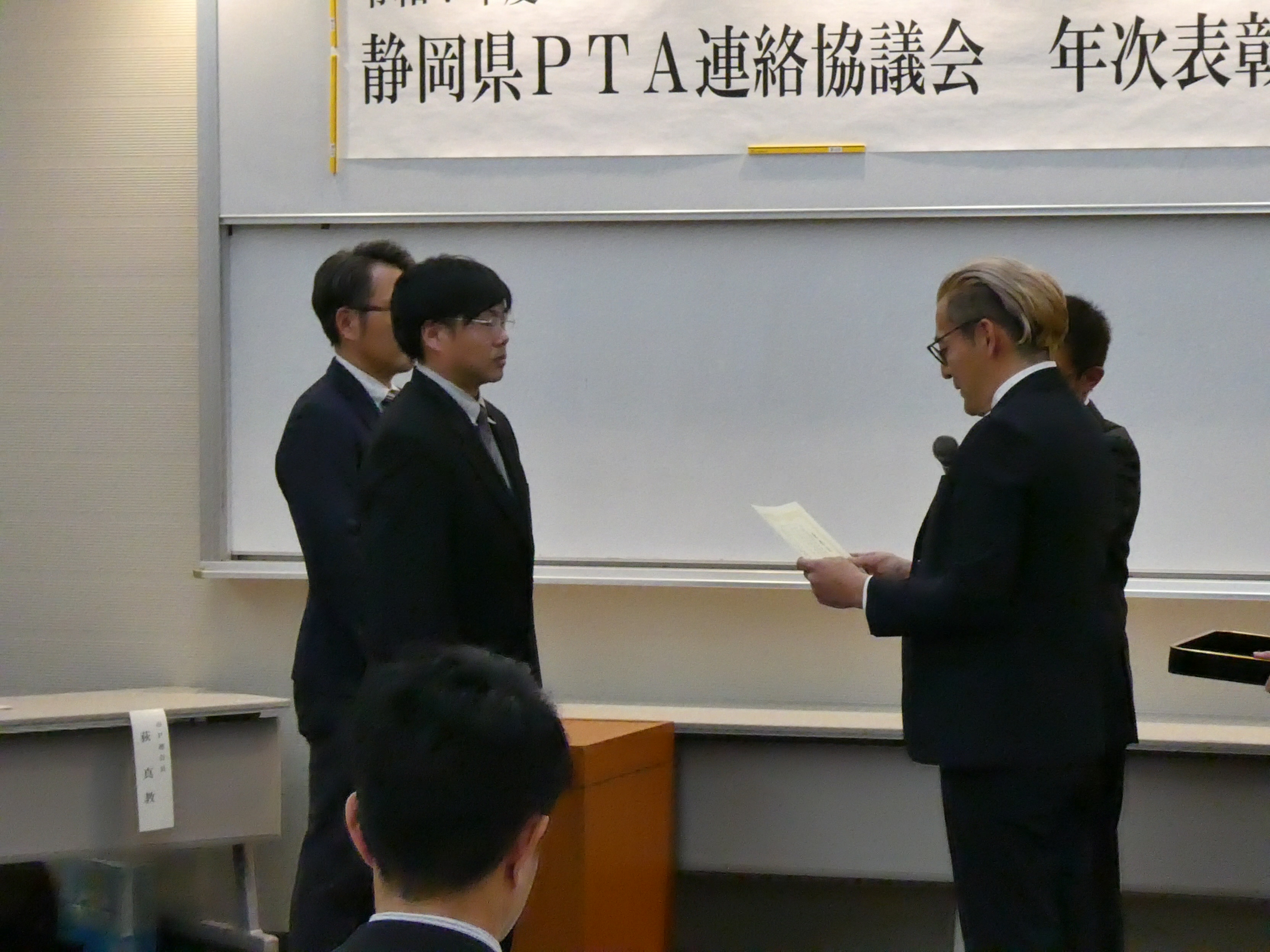 当日は、PTA活動を通して児童生徒の健全育成や地域教育活動の推進に長年尽力されてきた個人・団体の皆様、ならびに広報紙の部で優秀賞を受賞された学校、ネット・スマホ標語コンクール「保護者・教職員の部」において静岡県教育長賞を受賞された方の表彰が行われました。